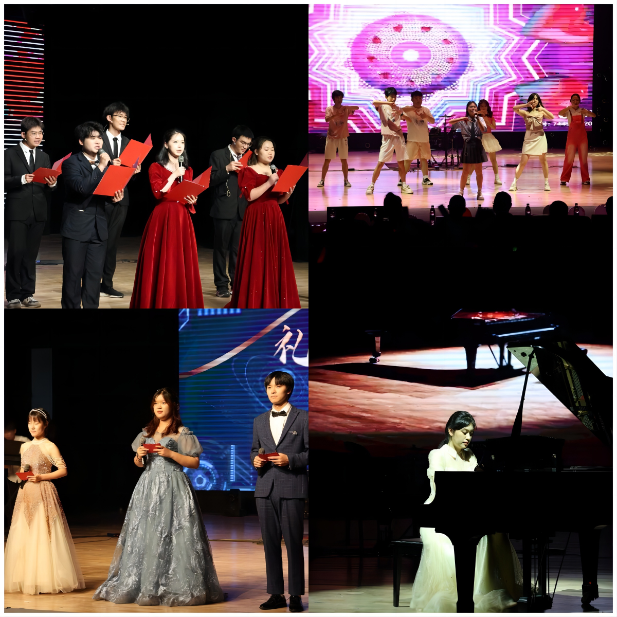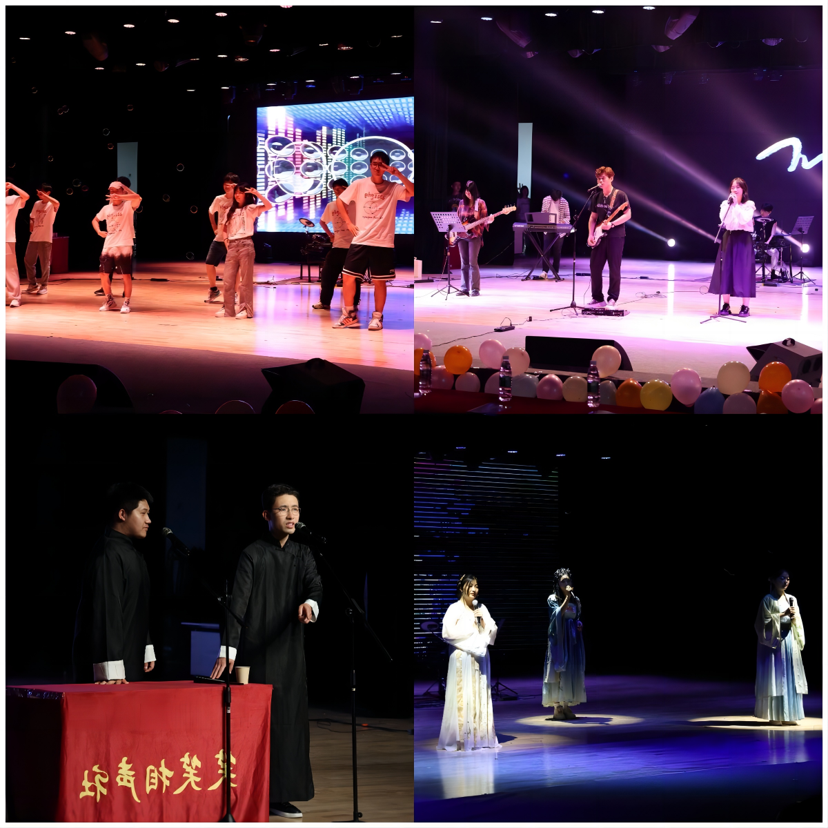 接下来,精彩的表演继续进行。串烧唱跳rap的同学神采奕奕,活力四射,动感十足,获得阵阵掌声;方言配音秀中,表演者巧妙选取了同学们熟悉的视频,用有趣的配音让大家笑逐颜开;钢琴弹奏《降G大调练习曲》让大家感受到钢琴的典雅之美;朗诵《祖国啊,我亲爱的祖国》激起了同学们深埋心底的爱国之情;乐队演奏歌曲串烧让大家跟着明快的节奏,尽情享受音乐带来的律动感;舞蹈《咆哮》则让同学们感受到了青春的活力与激情。在欣赏了这些有声有色的表演之后,相声《量子力学和广义相对论在相声创作和表演中的指导及应用》则将抽象难懂的物理知识通过相声表演这一形式呈现在大家面前,巧妙地引导大家去思考,让大家听后交口称赞;感受了物理学之精妙,歌曲演唱《借月》又将大家引入音乐的美妙当中;魔术表演为同学们呈现了一场神秘的视觉盛宴;吉他指弹在阵阵掌声中展现了高超的技艺。最后,在学院团委学生会各部门同学带来的舞蹈串烧中圆满结束。