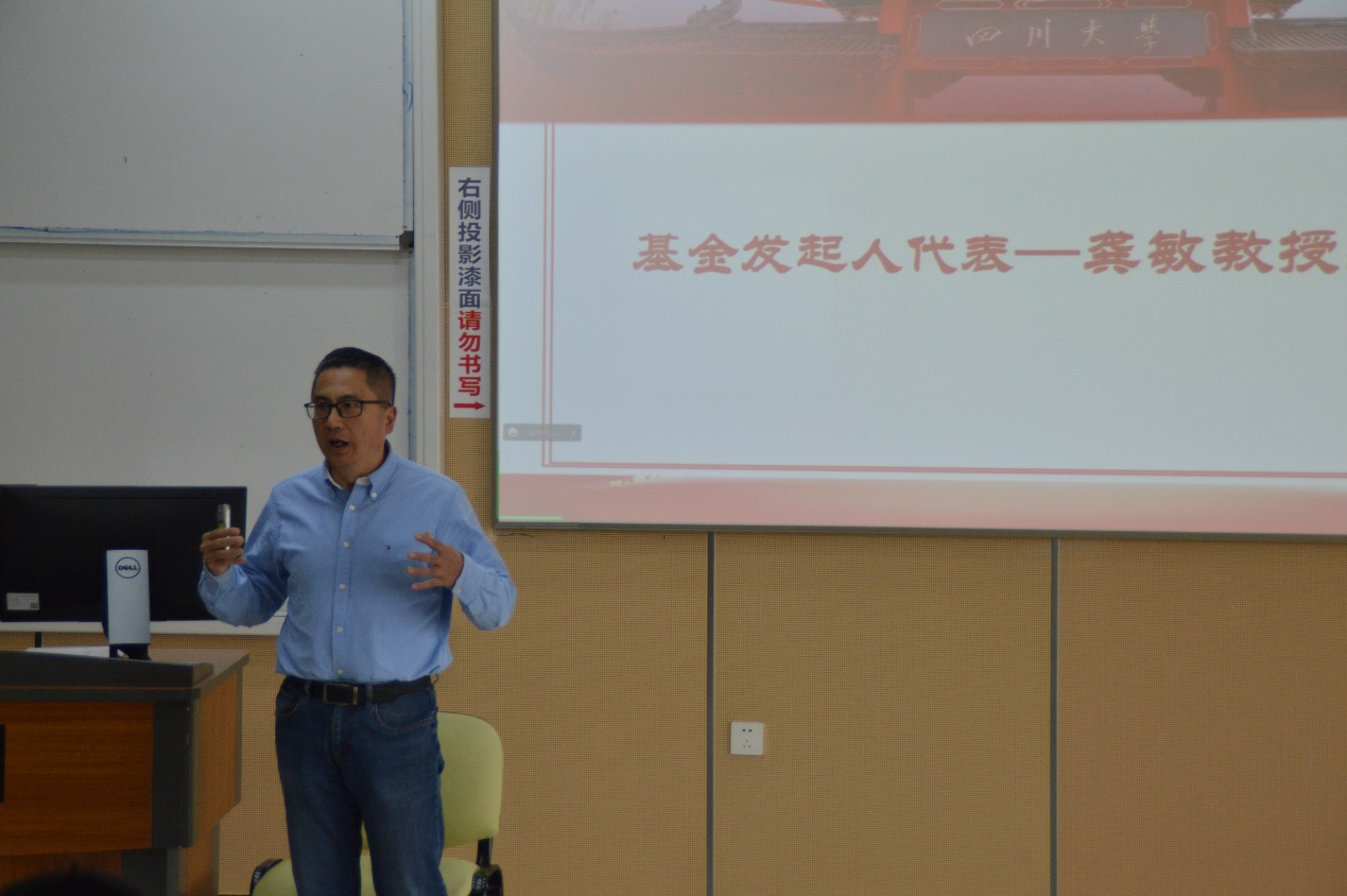 颁奖典礼正式开始后,同学们通过一段关于曾烁学长的纪念片以及曾烁奖学金基金会成立过程的视频了解了曾烁学长真诚、善良与勇敢的优秀品格。随后由龚敏教授致辞,他对同学们提出了未来的奋斗目标和要求,鼓励全体师生团结一致、努力奋斗,以曾烁学长为榜样,秉承“感恩,传承”的精神志存高远,勇往直前,为母校争光。之后,曾烁学长的大学同学秦炜,向同学们讲述了自己和曾烁曾经的大学时光,再一次让同学们看到了曾烁学长的真诚善良和远大志向,并以自身经历激励物理学子不断成长。