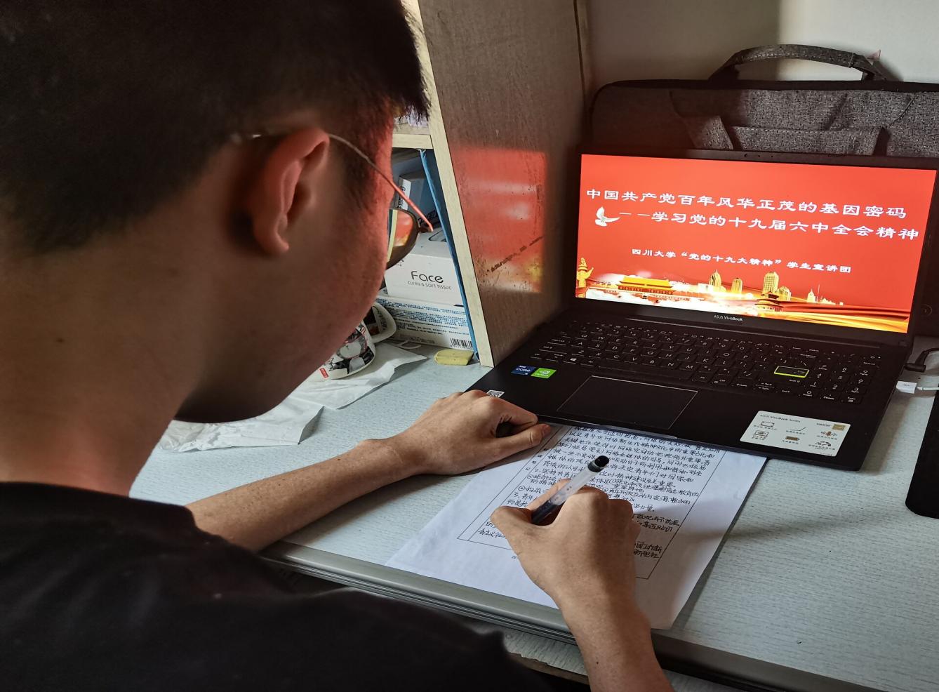 首先,参加团校的全体同学起立齐唱《中国共青团团歌》。紧接着,袁睿泓学长为同学们介绍了党的十九届六中全会精神,对我们提出了“不忘初心,牢记使命”的号召,并从十九届六中全会报指出的“一个根本问题”入手,介绍了大会上提出的“十个坚持”和中国共产党百年奋斗的宝贵历史经验以及中国共产党百年奋斗的历史意义和党的十九届六中全会的重大意义。最后,吴奇益学长与同学们分享交流学习经验,同学们积极提问,收获颇丰,表示掌握了不少的学习新方法。同学们认真听课并仔细记录行课笔记。