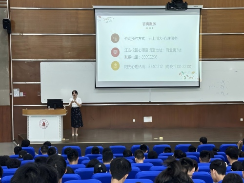 讲座尾声,冯佳老师提醒新生及时完成心理测评,详解学校心理健康教育中心的预约流程、咨询地点及24小时热线,鼓励大家主动寻求专业帮助。