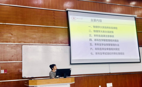 ‌讲座内容主要‌围绕物理学大类培养阶段课程、大类分流政策、以及选课注意事项等,还重点解读了学籍管理、学业预警、毕业审查、考试违纪作弊处理等学校相关管理规定。