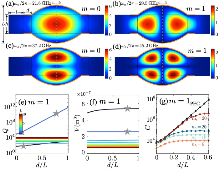 图. (a-d)不同共振模式的电场强度分布;(e-g)品质音子、模式体积、单原子协同参数。