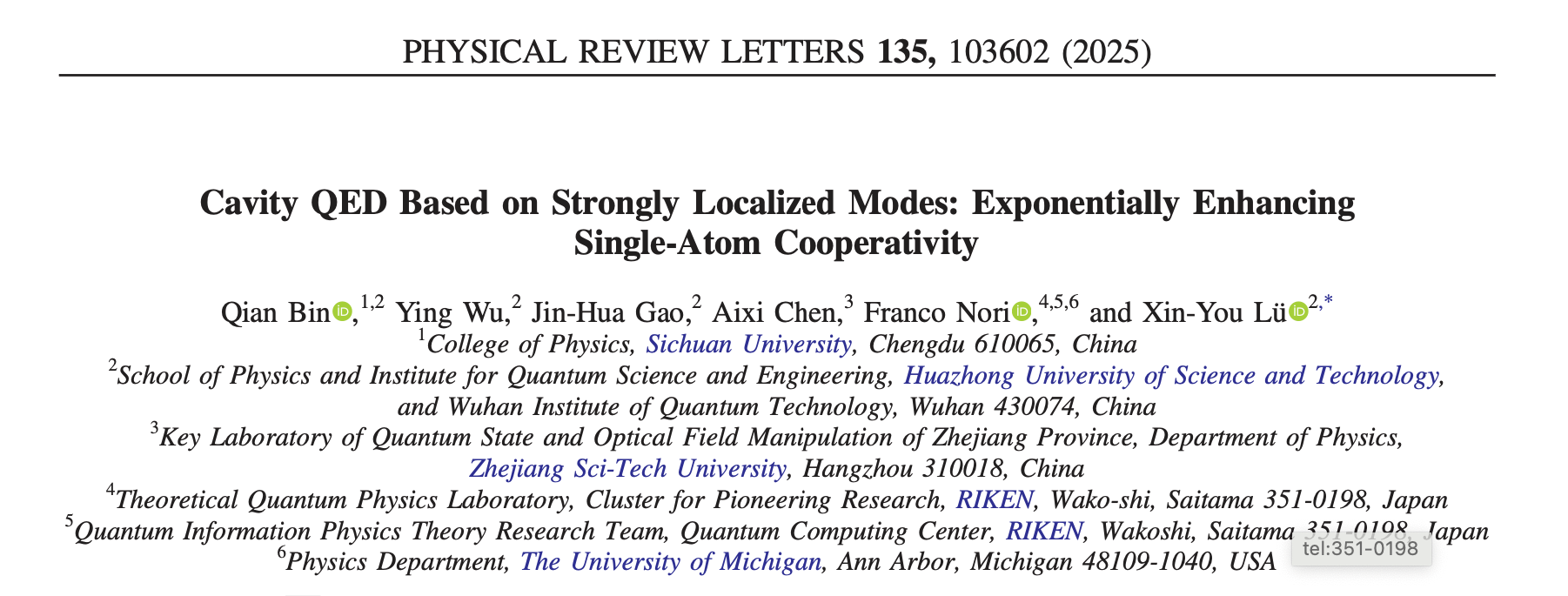 近日,PA集团官网特聘副研究员宾倩与合作者在物理领域国际顶尖期刊《物理评论快报》(Physical Review Letters)发表了题为《Cavity QED Based on Strongly Localized Modes: Exponentially Enhancing Single-Atom Cooperativity》的最新研究成果。该研究提出一种新方法,显著提升了腔量子电动力学(QED)系统中的单原子协同参数,为增强量子操控提供了新路径。pa集团官网入口为论文第一完成单位,PA集团官网特聘副研究员宾倩为论文第一作者,华中科技大学吕新友教授为论文通讯作者,主要合作者还有华中科技大学吴颖教授、高锦华教授,浙江理工大学陈爱喜教授和日本理化学研究所Franco Nori教授。