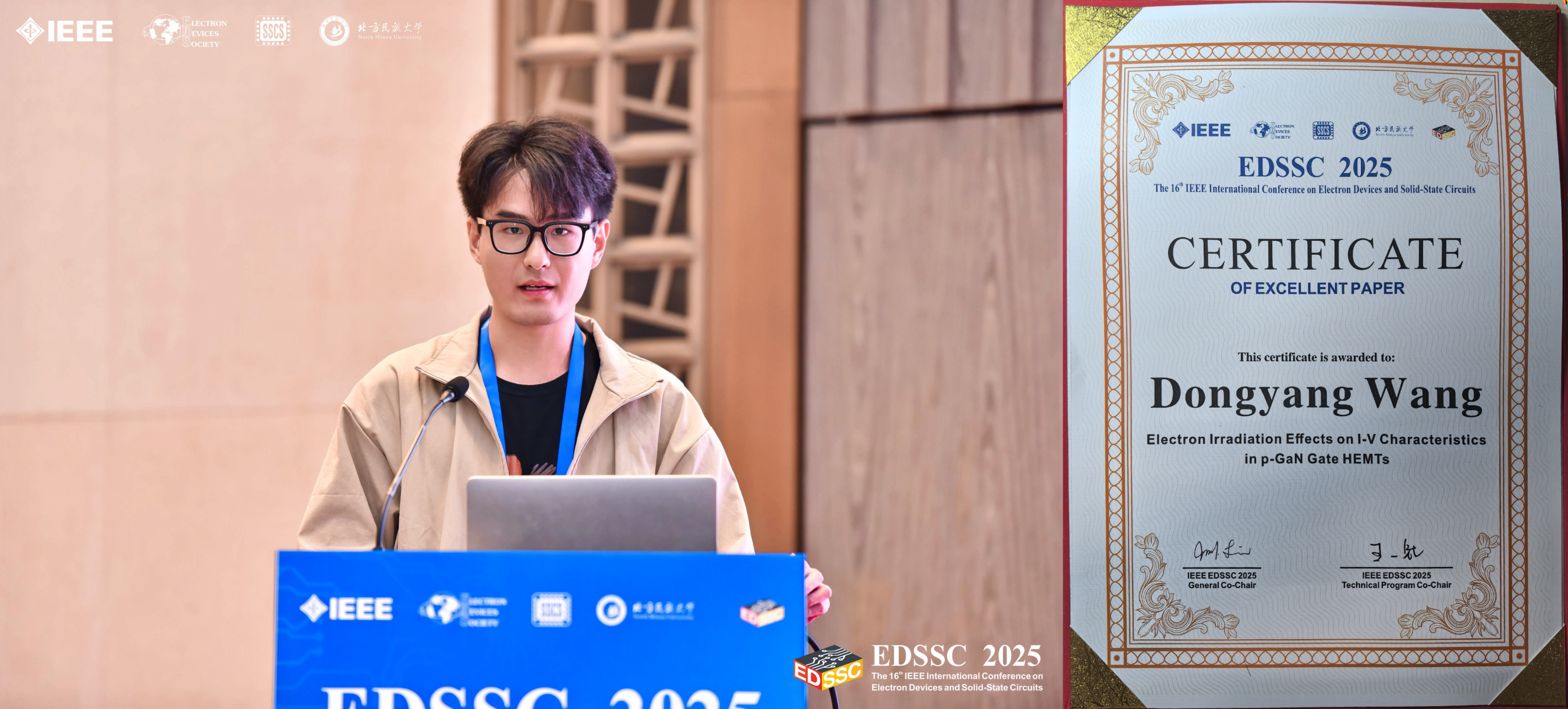 PA集团官网微电子教学研究中心的微电子抗辐照与可靠性团队硕士研究生王冬阳、陈鹏伟、郭睆实和邱爱霖均以第一作者发表论文并作了口头报告,其中论文的研究领域为功率半导体器件。王冬阳同学的论文《Electron Irradiation Effects on I-V Characteristics in p-GaN Gate HEMTs》获评“Excellent Paper”(优秀论文)。本次EDSSC会议共设置12个分会场,产生了18篇优秀论文,其中功率半导体器件分会场产生了2篇优秀论文,该团队论文是其中之一。