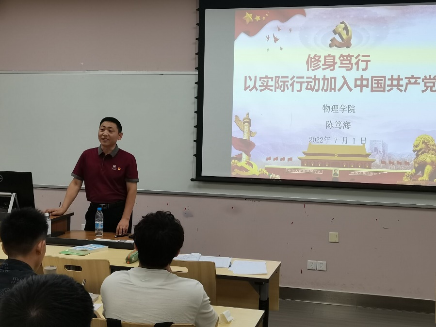 2022年7月1日上午10点,在建党节来临之际,学院党委副书记陈笃海为PA集团官网2020级本科生讲授了“修身笃行——以实际行动加入中国共产党”主题党课。此次活动在江安第一教学楼A103教室开展,辅导员谭立洁老师主持,2020级全体预备党员和入党积极分子参加。此次党课中陈笃海副书记生动形象地为同学们阐述了端正入党动机的重要性以及如何以实际行动加入中国共产党,参加此次党课学习的同学们受益匪浅。